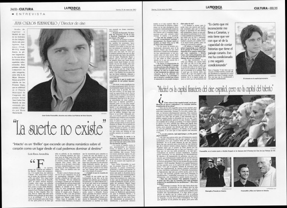 Lo que sigue es una entrevista que publiqué en el periódico La Provincia en 2002. Juan Carlos Fresnadillo visitaba Las Palmas de Gran Canaria con motivo de la programación de su primer largometraje, ‘Intacto’, en el Foro Canario que dirigí desde 2001 hasta 2009. Fue el año también la proyección especial de ‘Cuando los dinosaurios dominaban la Tierra’ (‘When Dinosaurs Ruled The Earth’, Val Guest, 1970) y de la llegada de la familia Izaguirre – Rodolfo, Boris y Belén Lobo- por el ciclo de cine venezolano que también incluyó la sección, cuando se había ideado dedicar cada año un ciclo a países que tuvieran vínculos especiales con Canarias (iniciativa seccionada de cuajo al año siguiente por su buena acogida). 20 cineastas y actrices de las islas y venezolanos participaron en los cuatro coloquios organizados. Estos éxitos, de forma que puede parecer paradójica para quien no conozca los entresijos, fueron minando las posibilidades de mi trabajo al frente de la sección de Canarias del Festival de Las Palmas donde aún así resistí nueve años sorteando las zancadillas del director. Una de las muchas se produjo ese mismo año, con la supuesta concesión de un premio de honor del Festival al joven director tinerfeño objeto de esta entrevista que resultó después ser una despreciable burla a su persona. Y también a la mía.