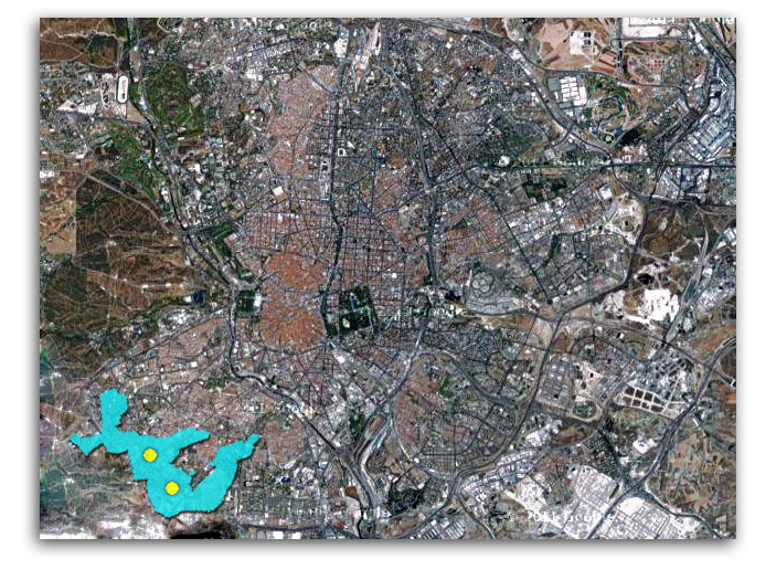 Destacada en la imagen inferior, el área que ocupa la barriada en la gran ciudad. En puntos de color amarillo, el lugar aproximado que ocupan las dos torres.