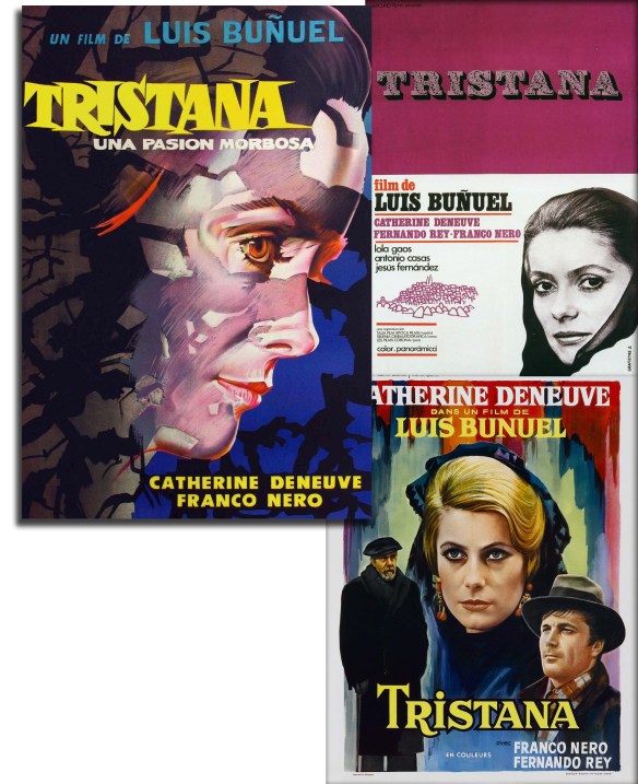 Con sumo atrevimiento, he tomado prestadas viñetas de El Roto y de Forges publicadas en diario El País en fechas recientes para las imágenes que abren y cierran este texto. En las fotos de Tristana, de arriba abajo, Luis Buñuel empuja la silla de Catherine Deneuve en una pausa del rodaje del filme; collage de carteles del filme para varios países, y Tristana inclinada ante la tumba del cardenal Tavera, esculpida por Berruguete, en un conocido momento del filme.
