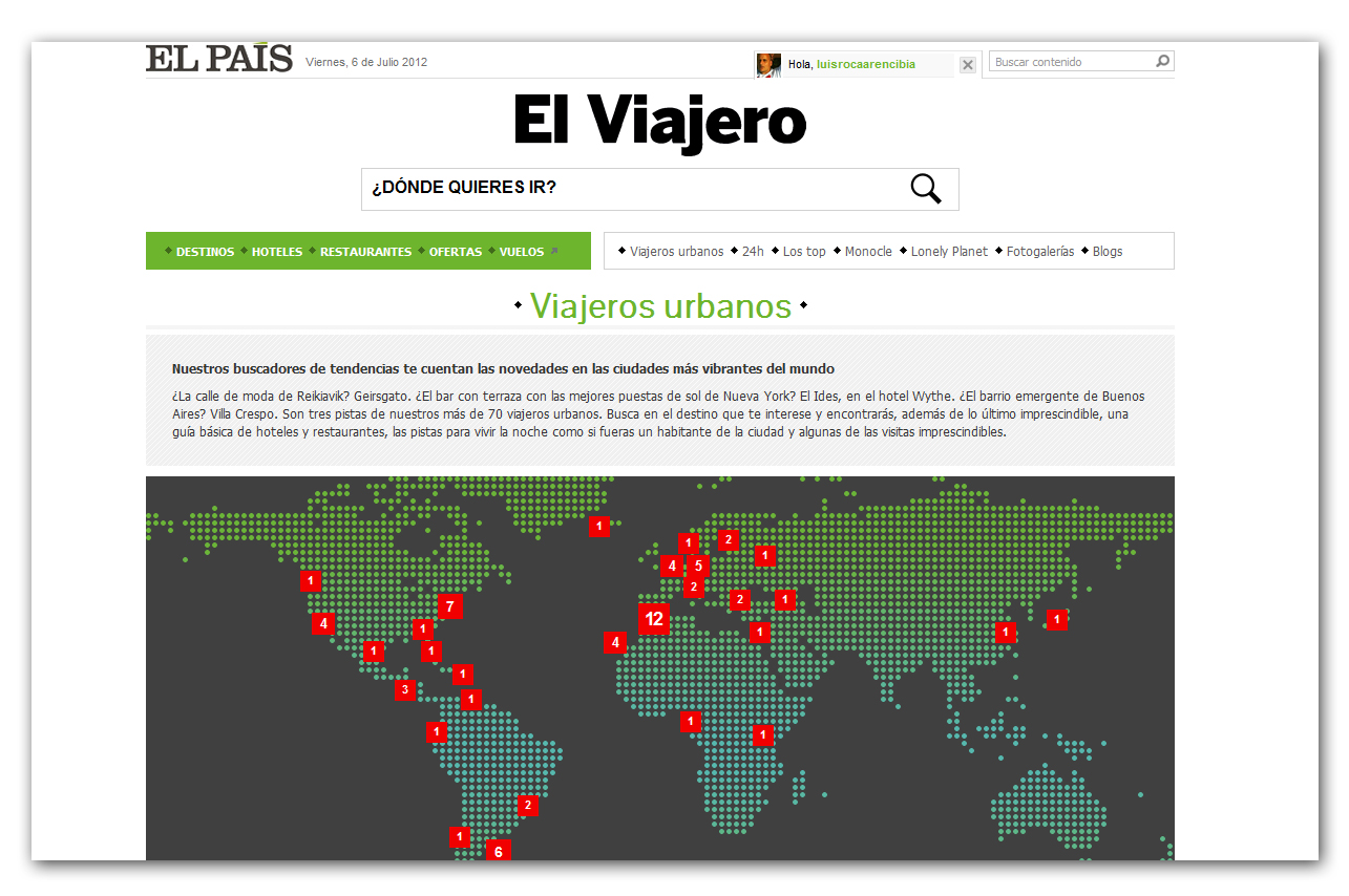 Una colaboración sobre el restaurante peruano Segundo Muelle (texto y foto) y una guía de la ciudad de Las Palmas son mis primeras dos aportaciones a Viajeros Urbanos, la expansión del suplemento El Viajero de El País en el universo puntocom. Espero que gusten. Unos 80 periodistas colaboramos desde distintas urbes del mundo para ir informando de cuantas novedades se produzcan en el radio de acción correspondiente en forma de pildoritas informativas más breves de la habitual colaboración para el diario de papel. En mi caso, Gran Canaria y especialmente, su capital, Las Palmas de Gran Canaria. En este bonito mapamundi que enlazo puede conocerse el quién es quién de los colaboradores a día de hoy. La guía de la ciudad espero poder actualizarla, siguiendo también -faltaría más- las sugerencias de los lectores.