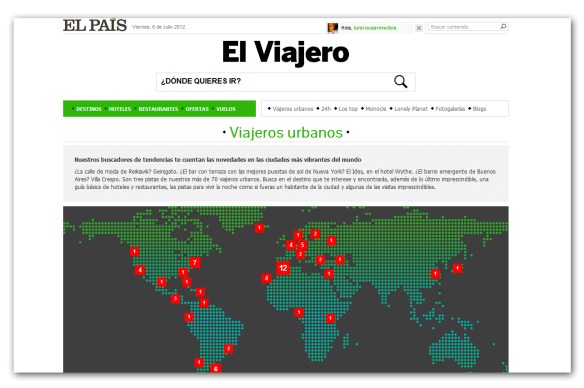 Acompañan el texto históricas capturas de pantalla de Viajeros Urbanos nada más salir de su primer horneado. La portada (arriba), el bonito mapamundi (centro) y dos capturas con artículos que fueron ilustrados con sendas fotos mías (debajo).