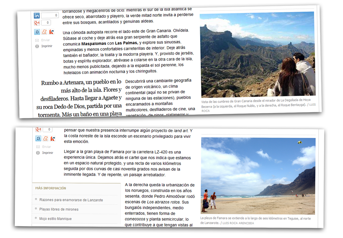 Acompaña esta primera entrega de Viajeros Urbanos una breve presentación del colaborador con una foto -en mi caso, realizada al corre corre y con notable eficiencia por mi hermana Yolanda en el parque Doramas después de llevar a los sobrinillos hamburgueses a natación en el Club Natación Metropole-. Además, las versiones digitales de algunos de mis artículos y/o fotografías realizados para El Viajero en papel desde 2003. Entre otros: «La corsetera de Paris Hilton« (2011, recomendaciones en Las Palmas de Gran Canaria acompañando texto de portada de Vicente Verdú); «Raquel Welch, reina guanche» (2010, sobre localizaciones de los principales rodajes de películas en las islas); «Las Canteras, con mucho ‘swing’ (2010, recomendaciones para la zona de la playa de Las Canteras); «Olas, vértigo y pirañas» (2008, reportaje sobre el parque temático Siam Park, que fue mi primera portada); «A lomos de Moby Dick» (2008, guía de 24 horas en Las Palmas de Gran Canaria); «Unos gnomos llamados gombusinos» (2008, guía de La Gomera): «El Hierro, en diez instantáneas» (2007, recomendaciones para El Hierro); «Un masaje de piedras volcánicas» (2006, el Spa del Jardín Botánico de Puerto de la Cruz, en Tenerife ); «Mascaritas y amanecer playero» (2004, algunas de las principales fiestas de las islas, desde Lanzarote hasta La Palma); «El sur lúdico de Gran Canaria» (2004, recomendaciones que recordaban los 40 años del inicio del turismo de masas en la isla); «Nueva arquitectura, viejos paisajes» (2003, guía de Santa Cruz de Tenerife) y «Playa, marcha y colores en Las Palmas» (2003, guía de Las Palmas de Gran Canaria, mi primera colaboración).
