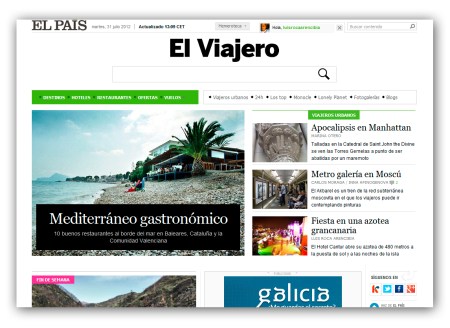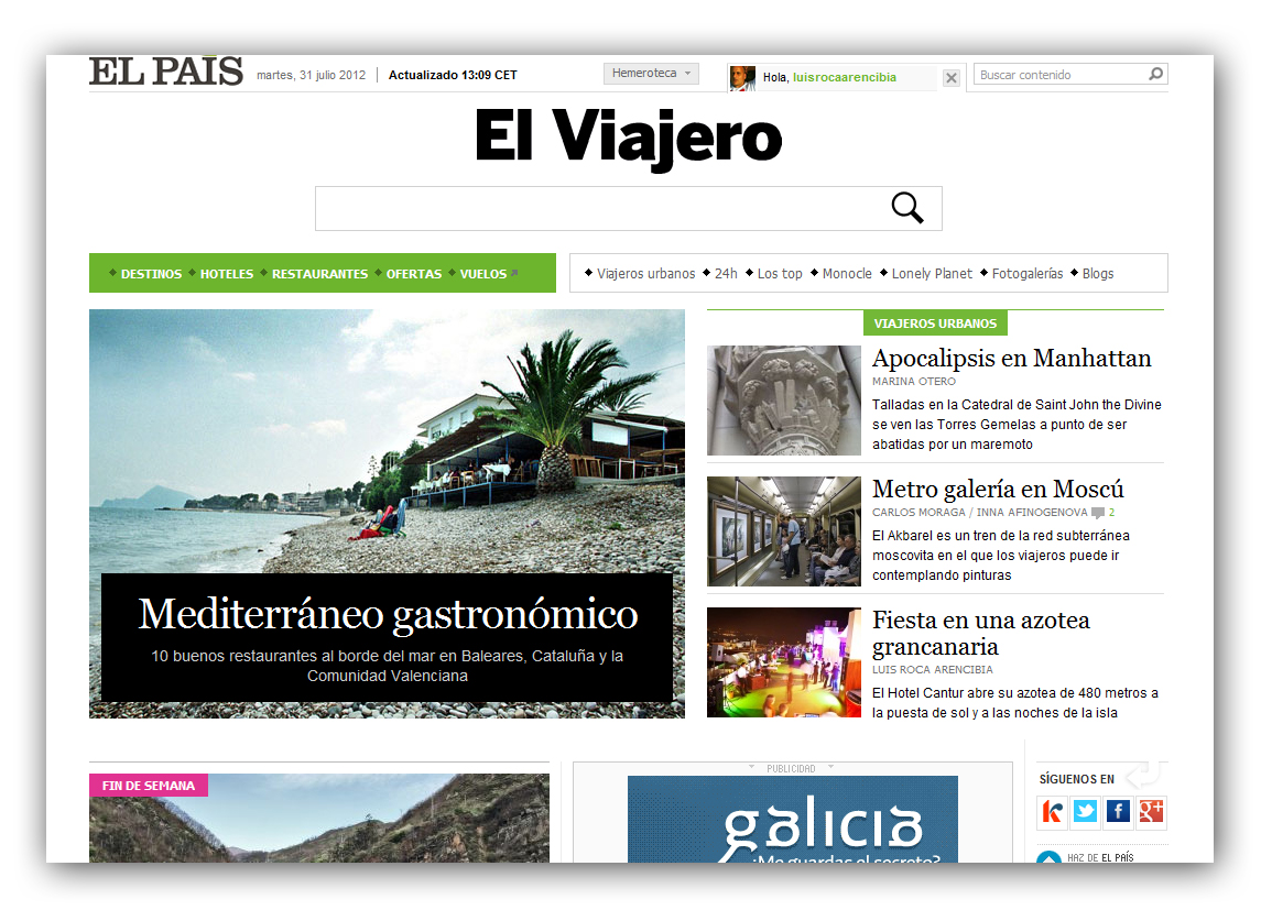 La colorida foto que acompañan la entrada en Viajeros Urbanos fue tomada por la propia organización en la fiesta inaugural, realizada, de forma muy oportuna, la noche de San Juan, coincidiendo con el inicio de las fiestas fundacionales de la ciudad de Las Palmas de Gran Canaria. Las dos con las que acompaño esta entrada las tomé el día que hice la pertinente visita. Fantásticamente acompañado por Marta, Alexandra, Elena Tanaisú y las dos Eneritz, la aldeana y la vasca. También añado la captura de pantalla, ahora mismo, de la página principal de El Viajero en Internet, con la entrada destacada bajo otras dedicadas a novedades en Nueva York y Moscú.