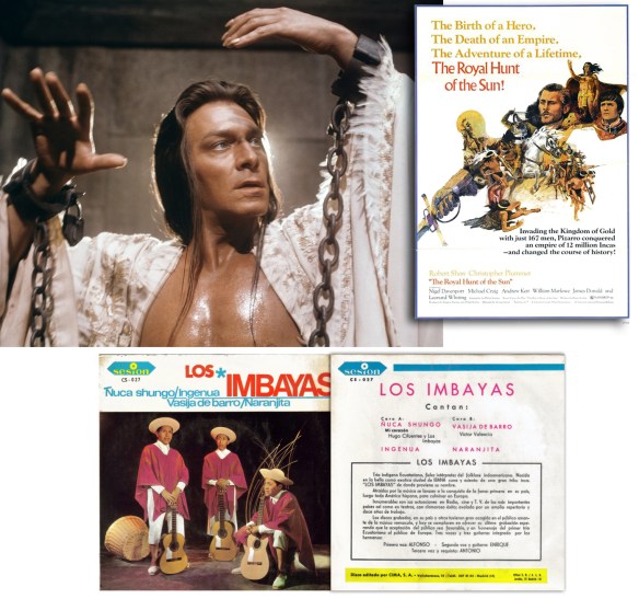 2) Christopher Plummer como el inca Atahualpa junto a un cartel de la película “The Royal Hunt of The Sun” (Irving Lerner, 1969), primera en la que Santana trabajó. Debajo, single del trío ecuatoriano “Los Imbayas”, con los que Andrés compartió piso en 1969 en Madrid.