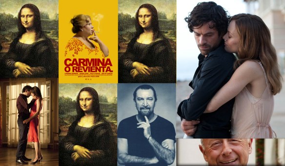 2) Tres copias de la Mona Lisa, de Leonardo Da Vinci, junto a imágenes de «La felicidad nunca viene sola» (abajo izquierda); «Los seductores» (derecha arriba); cartel de «Carmina o revienta»; retrato del bailarín Maurice Béjart (abajo centro) y Primerísimo Primer Plano de Tony Scott (debajo derecha).