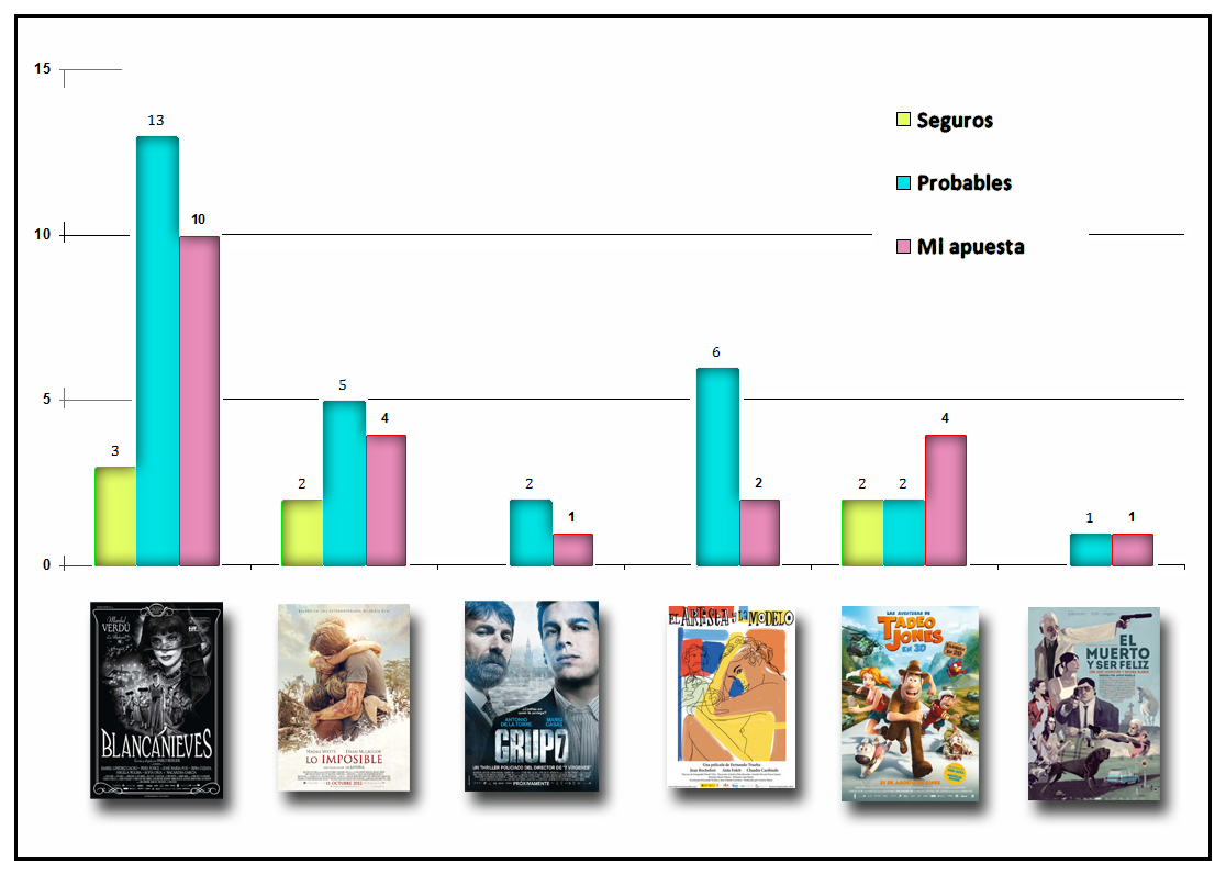 Gráfico que resume mis predicciones para los 27 Premios Goya Publicado el 16 febrero, 2013 a 1116 × 797 en Mis predicciones para los 27 Premios Goya, en El Asombrario En tres columnas, los seguros (verde), los probables (azul) y mi apuesta (rojo).