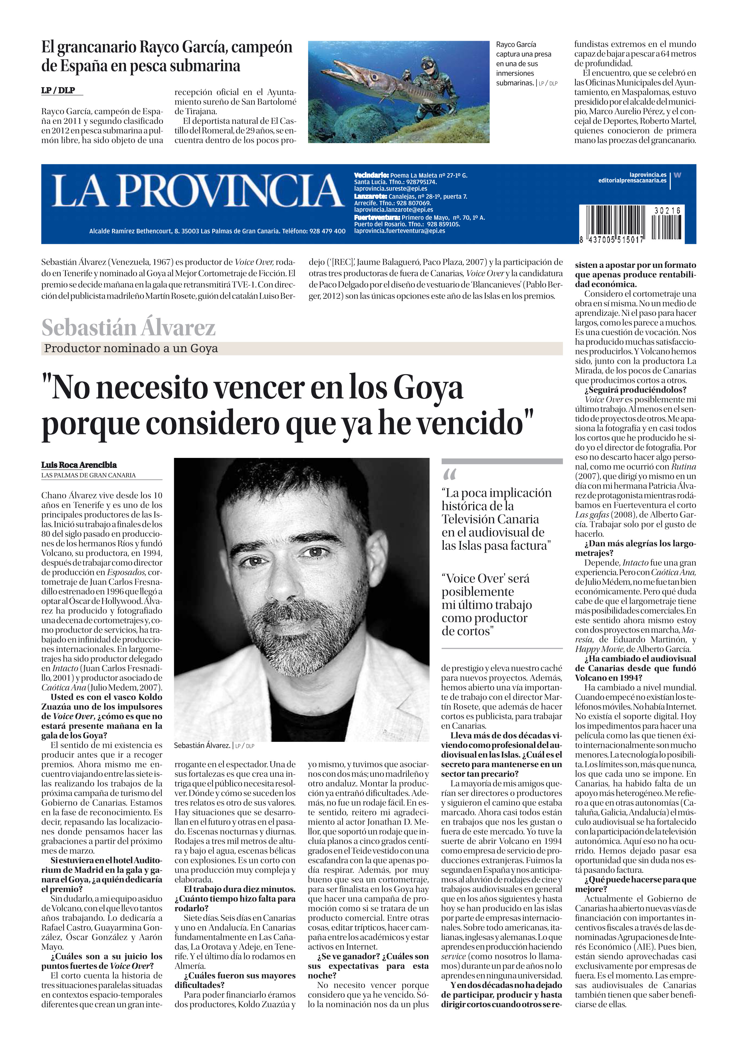 Entrevista de Sebastián Álvarez en La Provincia. Publicado el 20 febrero, 2013 a 2389 × 3369 en Más sobre Paco Delgado, diseñador de vestuario / Sebastián Álvarez, productor / Canarias en los Premios Goya / Balance de la 27 edición Esta entrevista a Sebastián Álvarez ocupó la contraportada del periódico La Provincia el sábado anterior a los Goya. El domingo lo replicaría La Opinión de Tenerife. LUIS ROCA ARENCIBIA