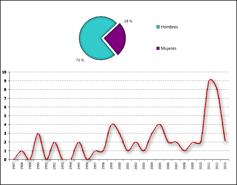 La gráfica muestra año a año el número de candidaturas de cineastas canarios en los Goya. A partir de la edición de 1997 siempre ha habido al menos una candidatura. La gráfica circular muestra la proporción entre hombres y mujeres. LUIS ROCA ARENCIBIA