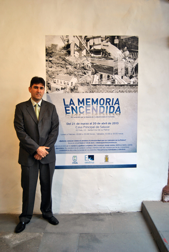 José Antonio Melián, jefe de la central de Los Guinchos, junto al cartel de la exposición. Publicado el 27 marzo, 2013 a 551 × 823 en Llega a La Palma la exposición La Memoria Encendida, sobre la historia de la electricidad en Canarias Foto de RUBÉN LÓPEZ.