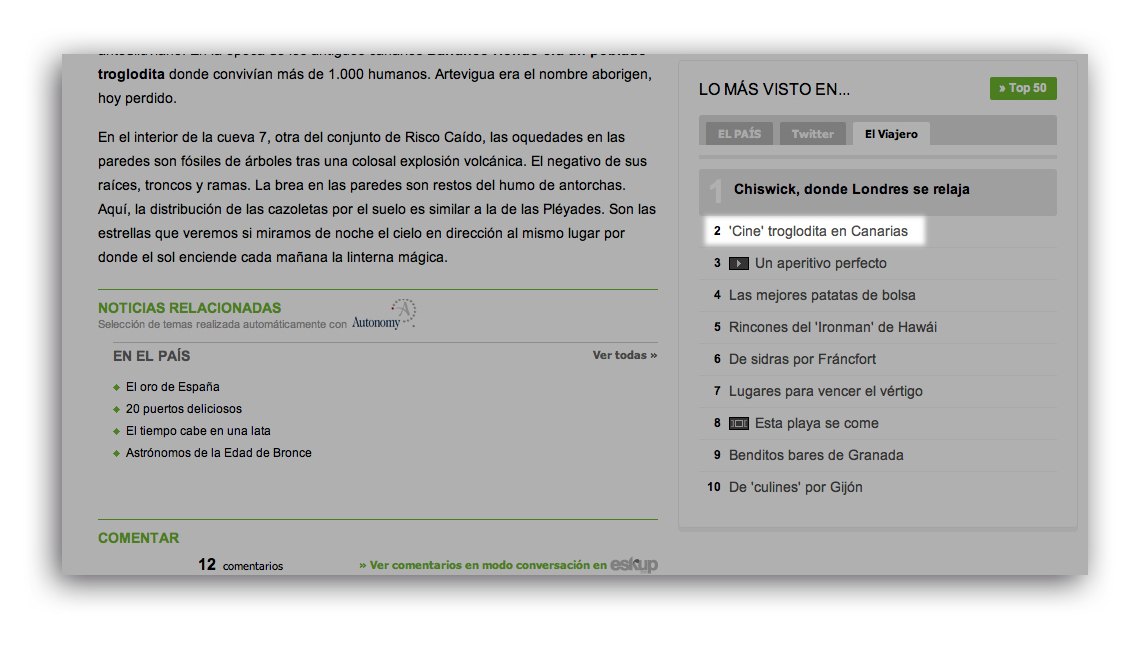 El cine´troglodita´de Gran Canaria lo titularon finalmente en EL PAÍS. Yo, de manera más poética, propuse Risco Caído enciende su linterna mágica, aunque si lo que hubiéramos querido sería aumentar el número de visitas podría haberse titulado también El primer porno de la historia se rodó en Artenara. La entrada estuvo cuatro días entre las más leídos de la sección. Llegó a subir hasta el puesto número 2.
