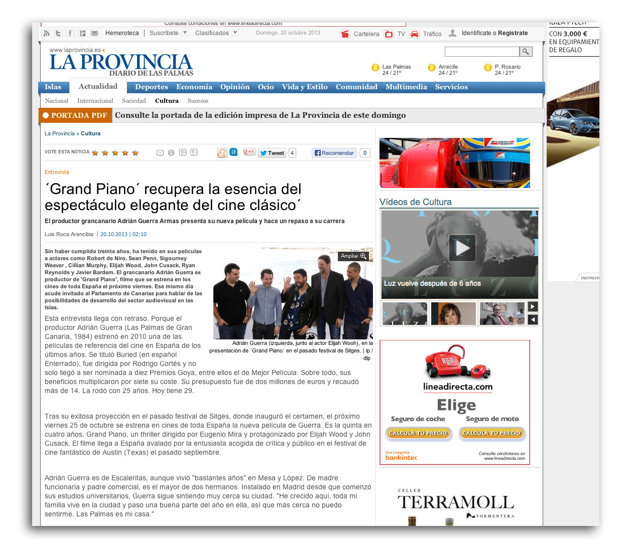El periódico La Provincia pública hoy la primera entrevista en medios de comunicación del productor Adrián Guerra (Las Palmas de Gran Canaria, 1984). Aquí puedes leerla. Guerra es productor de Buried (Enterrado, Rodrigo Cortés, 2010); Guest (José Luis Guerín, 2010), Emergo (Carles Torrens, 2011); Luces Rojas (Red Lights, Rodrigo Cortés, 2012) y Grand Piano (Eugenio Mira, 2013), que el viernes 25 de octubre se estrena en salas. Sin haber llegado aún a la treintena, ha tenido en sus películas a actores como Robert de Niro, Sigourney Weaver, Sean Penn, Cillian Murphy, Elizabeth Olsen, Ryan Reynolds, John Cusack y Javier Bardem.