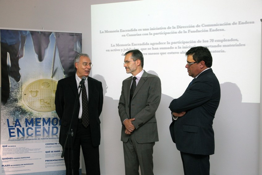 Momento para las palabras de inauguración de la muestra, pronunciadas por parte de Endesa por Ramón Rodríguez (d), director de Generación. El acto fue presidido por el alcalde, Marcial Morales (c). Lo cerró Manuel Miranda, consejero del ramo del Cabildo de Fuerteventura. / ACFIPRESS