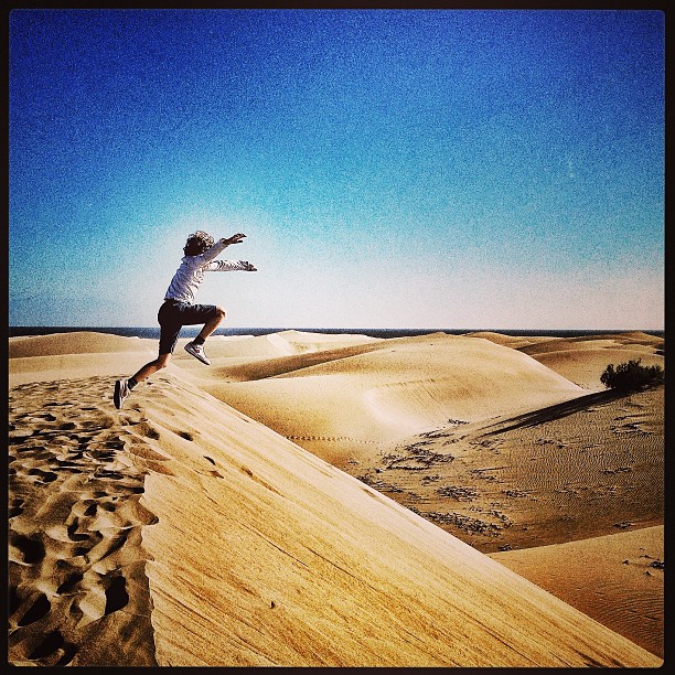 Esta foto de Tim saltando en las dunas de Maspalomas fue una de las tres elegidas para ilustrar el reportaje «24 horas en Maspalomas» que publiqué en 2013 en El Viajero de EL PAÍS. Una miniatura de la imagen ocupó la zona superior derecha de la portada del diario. Foto: LUIS ROCA ARENCIBIA