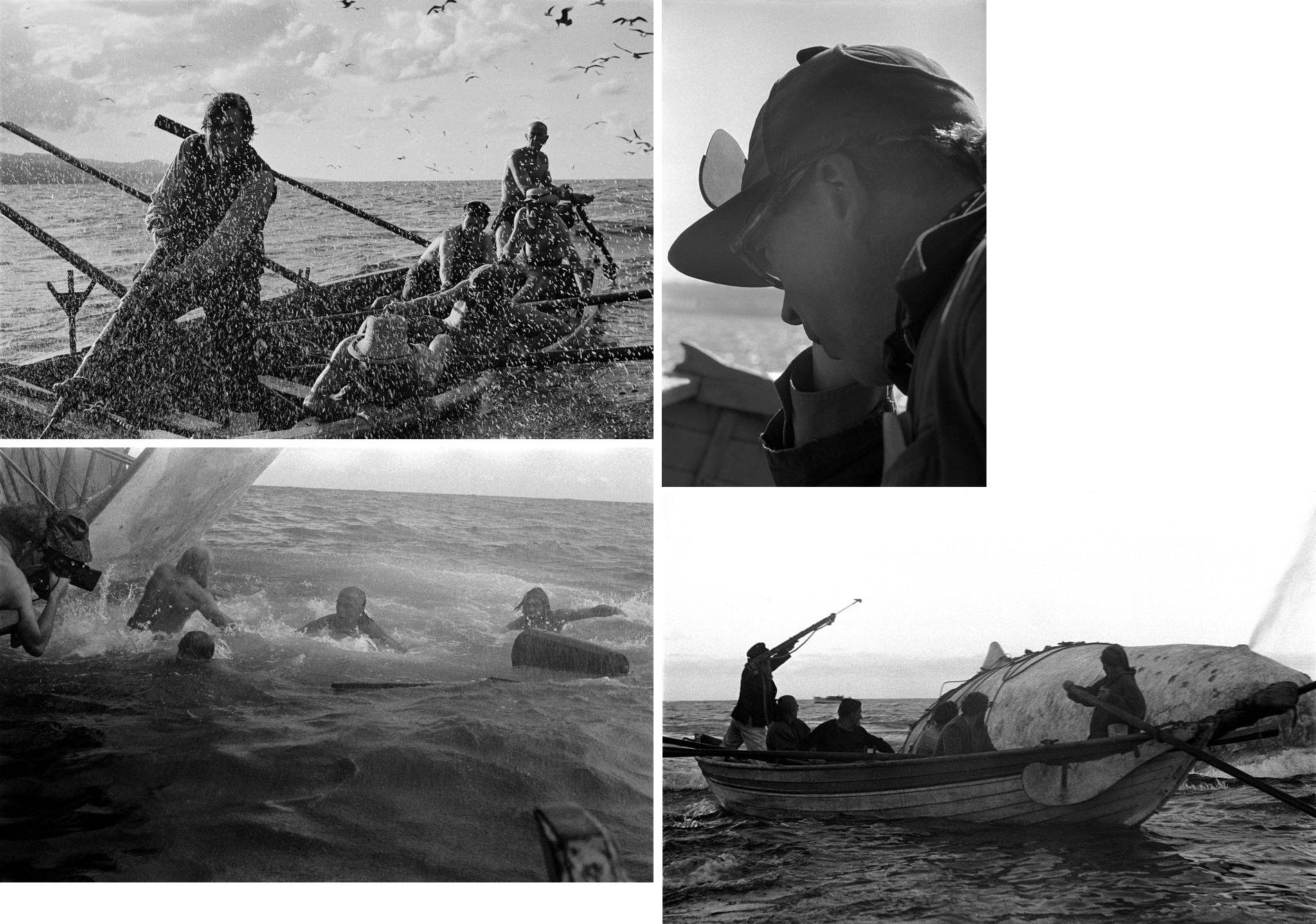 Las fotos de Lessing, algunas de las cuales reproduzco en esta entrada, son un autético tesoro. Ayudan a comprender mejor vicisitudes del rodaje, confirman aspectos que había descubierto en el curso de mis investigaciones -iniciadas especialmente a partir de la muerte de Gregory Peck en 2003- y alumbran nuevas circunstancias. Para los que trabajaron en el filme, y sus descendientes, son una nueva oportunidad de encontrar en alguna de ellas a sus seres queridos. Ahora sabemos que fue Lessing quien hizo esas fotos de Peck afeitándose la barba que caracterizaba al Capitán Ahab; vemos a la impresionante maqueta surcar las aguas de la vertiente este de la ciudad con operarios a bordo; a John Huston disfrutando del trabajo de dirección del filme; a Richard Basehart colgado del ataúd de Queequeg en la última secuencia del filme y comprobamos lo que intuíamos, que había sido rodada en la bahía del Confital; a Friedrich von Ledebur (Queequeg) flotando entre otros actores en el mar en las escenas del naufragio; vemos el operativo necesario para rodar la secuencia que logró el plano más importante del filme, según palabras del propio Huston en sus memorias «A libro abierto»; comprobamos que además del cuerpo de la ballena y la cola hizo falta construir un decorado especial para ese momento en que Peck colgaba de la ballena y movía su brazo inerte; vemos nuevas instantáneas del complicado rodaje en las barcas balleneras también construídas en el puerto de La Luz por carpinteros de ribera canarios…