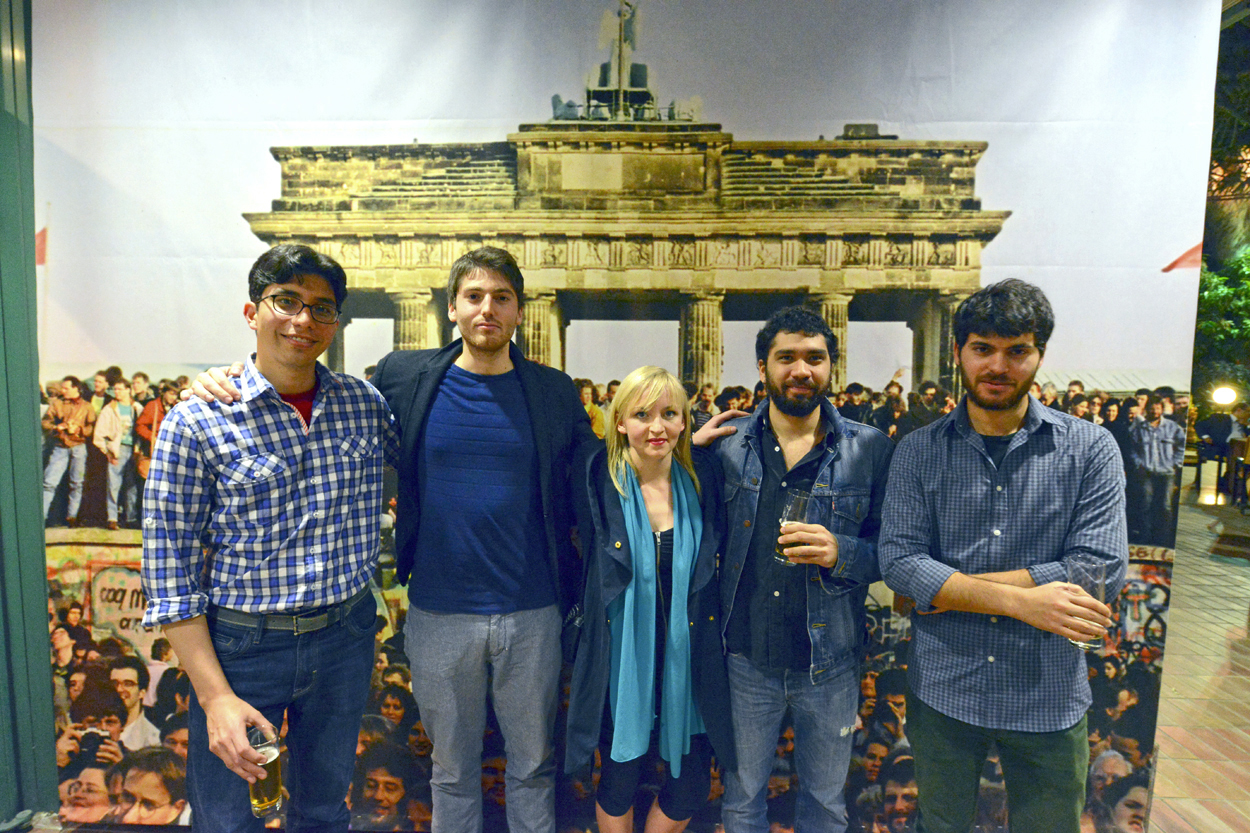 De izquierda a derecha, Camilo Cabrera (Colombia); Mladjen Minic (Serbia); Darja Pilz (Alemania); Nicolás Aguilar (Méjico); y Falcao (Portugal), algunos de los cortometrajistas del mundo invitados a El Cairo, en la recepción ofrecida en la embajada alemana. EL primero obtendría una mención en el palmarés.