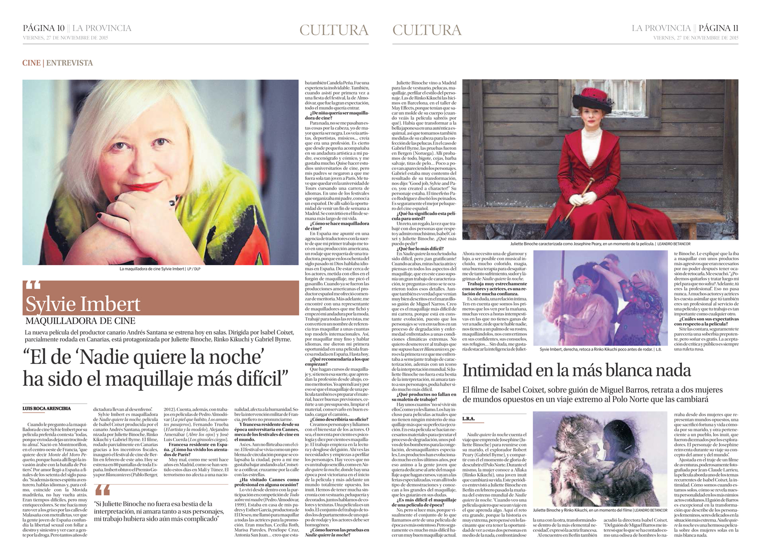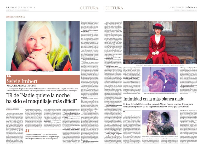 Dossier Personalizado Publicado el 27 noviembre, 2015 a 1542 × 1132 en Sylvie Imbert: “El maquillaje de “Nadie quiere la noche” ha sido el más difícil de mi carrera” Así fue publicada la entrevista ayer en el periódico La Provincia. / OAC