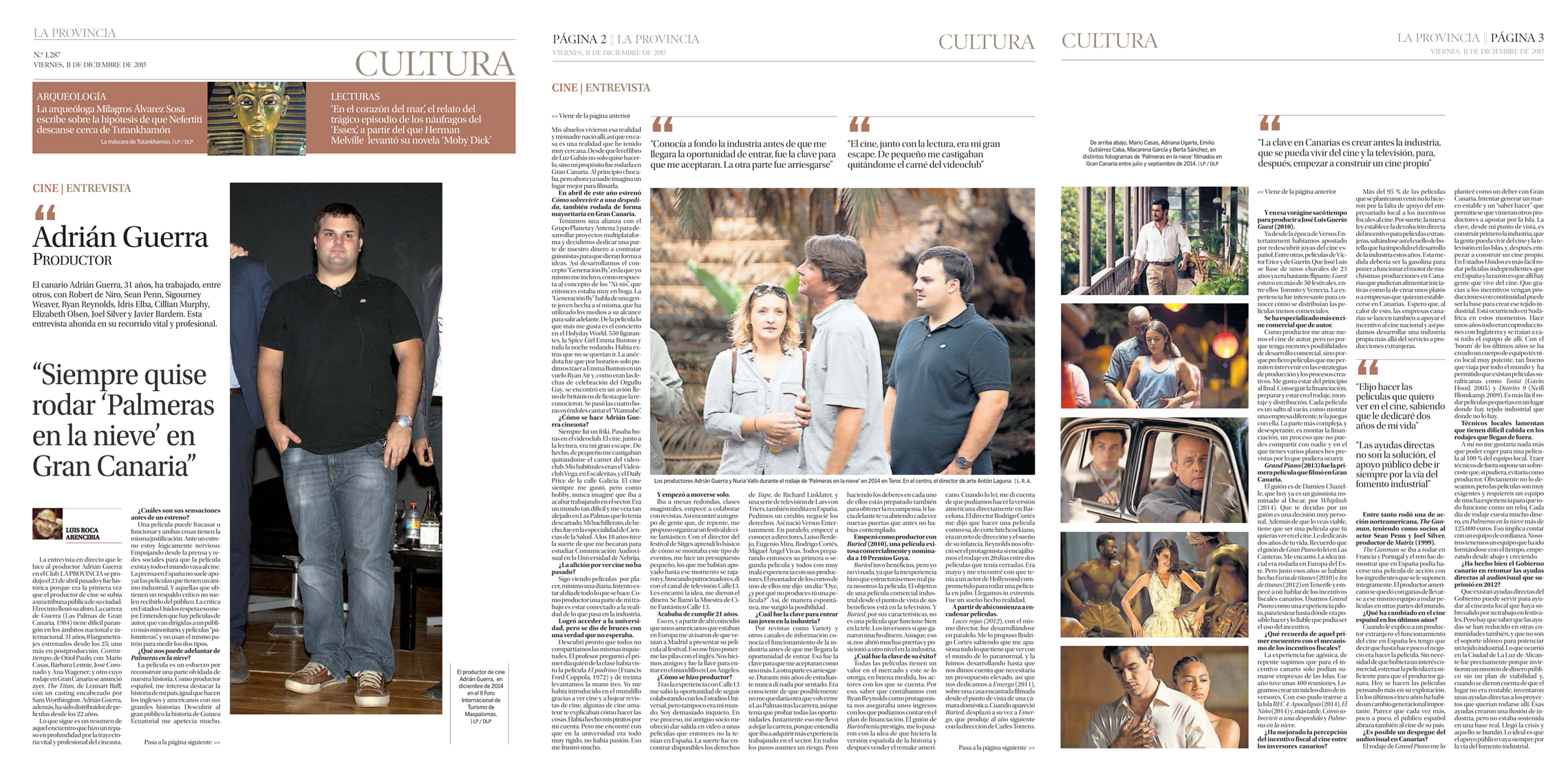 Dossier Personalizado Publicado el 15 diciembre, 2015 a 2279 × 1125 en Adrián Guerra: “Siempre quise rodar ‘Palmeras en la nieve’ en Gran Canaria” Así salió publicada la entrevista a Adrián Guerra en La Provincia el viernes, 11 de diciembre. / OAC