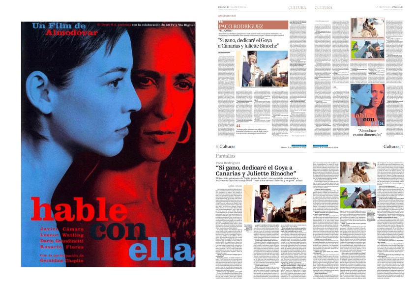 HableConElla Publicados Publicado el 7 febrero, 2016 a 2197 × 1500 en Paco Rodríguez, peluquero: “Gracias a Juliette Binoche trabajé en “Nadie quiere la noche” Junto al cartel de «Hable con ella», primera película de Paco Rodríguez fuera de Canarias, las entrevistas tal y como fueron publicadas en La Provincia y La Opinión de Tenerife estos días. / OAC