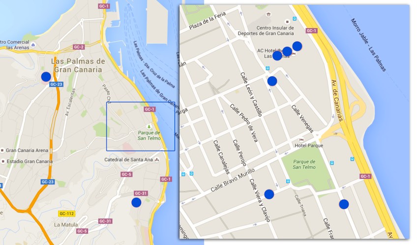 100AÑOSLP MAP Publicado el 19 marzo, 2016 a 1250 × 735 en Especial “Cien años de perdón”, el rodaje en Las Palmas de Gran Canaria En azul, los lugares donde se rodó «Cien años de perdón» en Las Palmas de Gran Canaria. / Elaboración OAC
