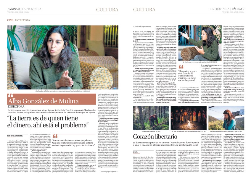 Julie en La Provincia Publicado el 10 abril, 2016 a 2376 × 1698 en Alba González de Molina: «Por mucho que quieras escapar, la tierra es de quien tiene el dinero» .Así salió la entrevista en el suplemento de Cultura de La Provincia del viernes 8 de abril. / OAC
