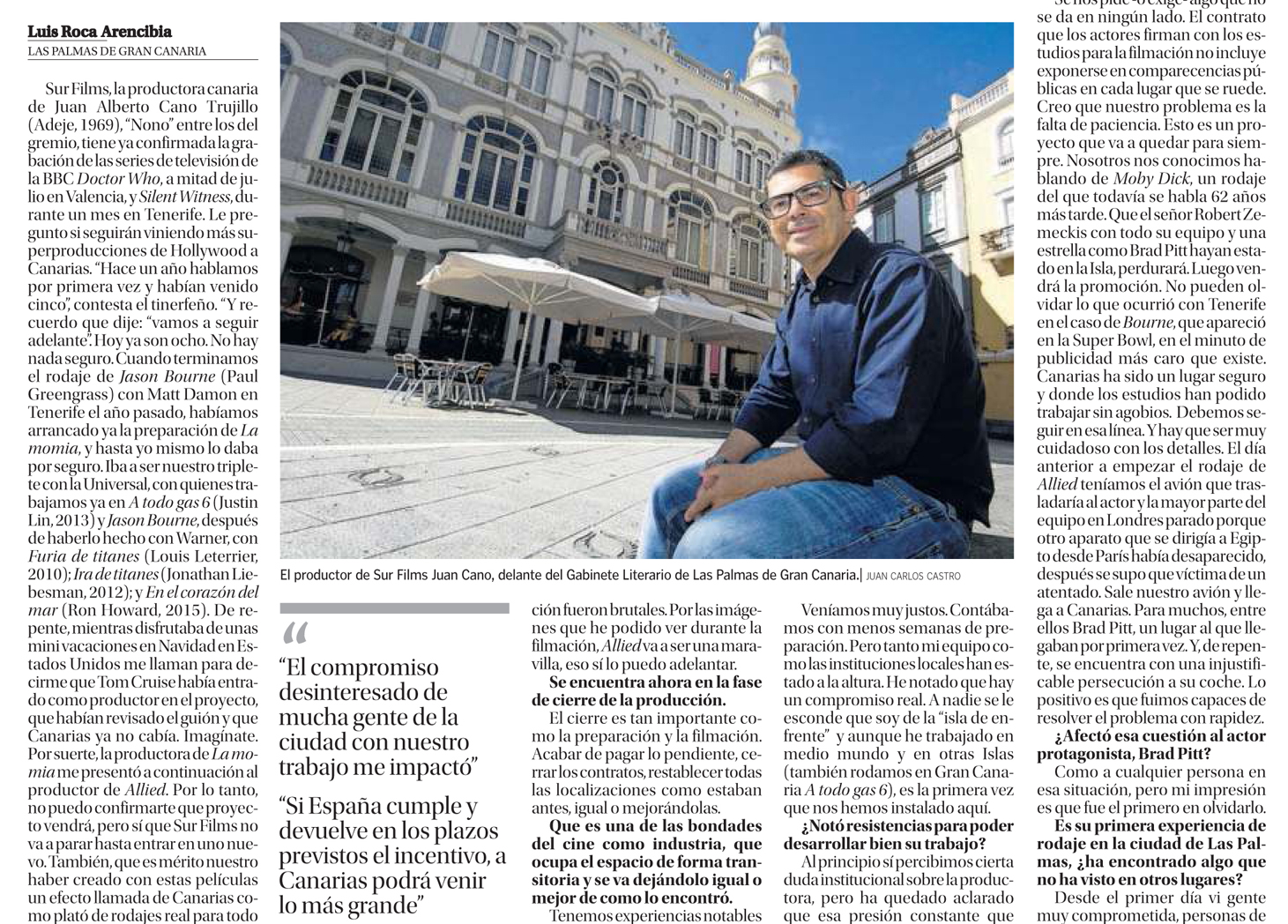 Dossier Personalizado Publicado el 13 junio, 2016 a 1461 × 1048 en Juan Cano (Nono), productor de Sur Film: «Aliados», con Brad Pitt, Marion Cotillard y Robert Zemeckis, llegó a Gran Canaria por el Gabinete Literario» Otro fragmento de la entrevista, tal y como apareció en La Provincia. La foto también es de Juan Carlos Castro. / OAC