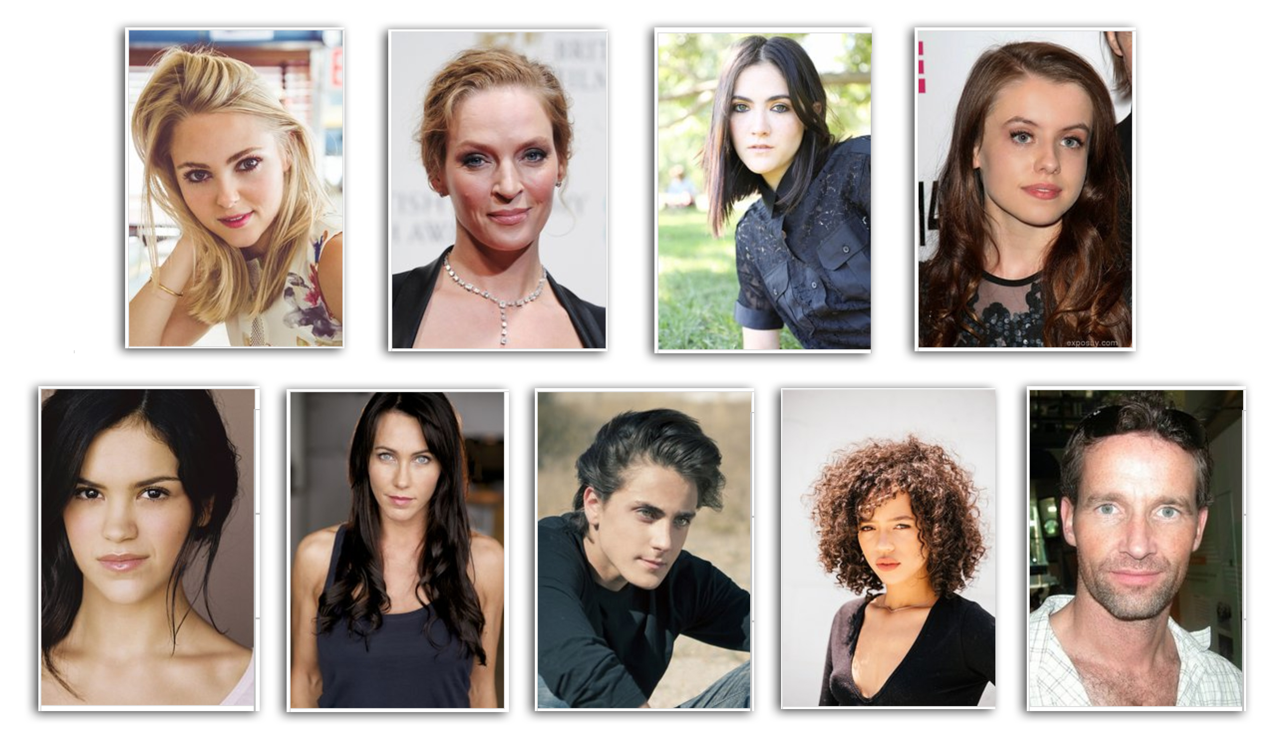 Imágenes del casting principal de «Down a Dark Hall», de izquierda a derecha y de arriba abajo: AnnaSophia Robb, Uma Thurman, Isabelle Fuhrman, Rosie Day, Victoria Moroles, Kirsty Mitchell, Noah Silver, Taylor Russell y Jim Sturgeon, de la web IMDB / OAC
