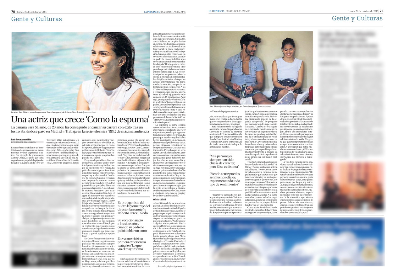 Sara Sálamo (Santa Cruz de Tenerife, 1992), pómulos angulosos, labios carnosos, ojos penetrantes y negros como cabezas de alfiler, es, además, actriz principal en “Como la espuma”, el nuevo largometraje del lanzaroteño Roberto Pérez Toledo, que se rodó durante tres semanas entre agosto y septiembre pasado en Madrid. Preguntado por ella, el director lanzaroteño la describe como «muy inteligente, intuitiva y fácil, un soplo de buen rollo en el rodaje. La película es coral, pero Sara tiene una de las tramas más presentes, empieza y acaba con ella«. De «Como la espuma» Sálamo recuerda que “después de pasar un verano de calor tremendo, heló en Madrid justo el día en que debía filmar mi escena en la piscina. A las ocho de la mañana teníamos que estar dentro, filmando también bajo el agua. El momento me recordó a otro rodaje, el de la película producida por Santiago Segura “Tres60” (Alejandro Ezcurdia, 2013). Ahí estábamos dentro de una tienda de campaña en un bosque de Navarra, en una jornada de madrugada a menos tres grados de temperatura, todo el equipo con plumas y abrigos y mi personaje desnudándose. Los labios se me pusieron morados, me traían calditos, lo pasé realmente mal. Cuando notas que el cuerpo deja de resistir solo piensas en hacer lo que tienes que hacer y que el resultado quede bien”.