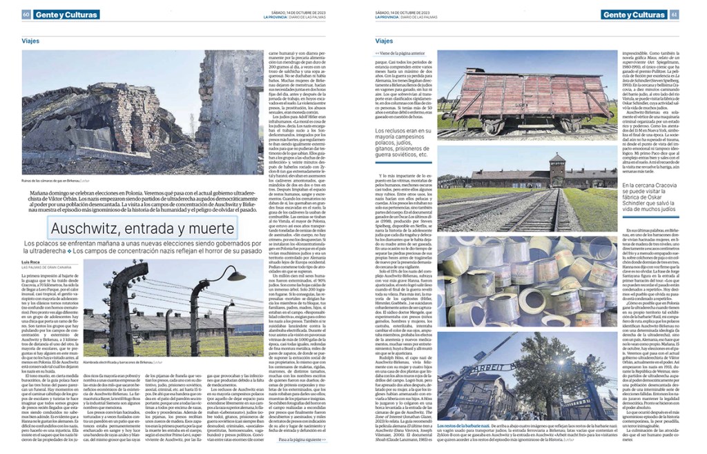 Hoy domingo se celebran elecciones en Polonia. Veremos qué pasa con el actual gobierno ultraderechista, que suma ya dos legislaturas seguidas gobernando el país. Los nazis empezaron siendo partidos de ultraderecha aupados democráticamente al poder por una población desencantada. Este texto, crónica de una visita a los campos de concentración nazis de Auschwitz-Birkenau, se publicó en La Provincia.