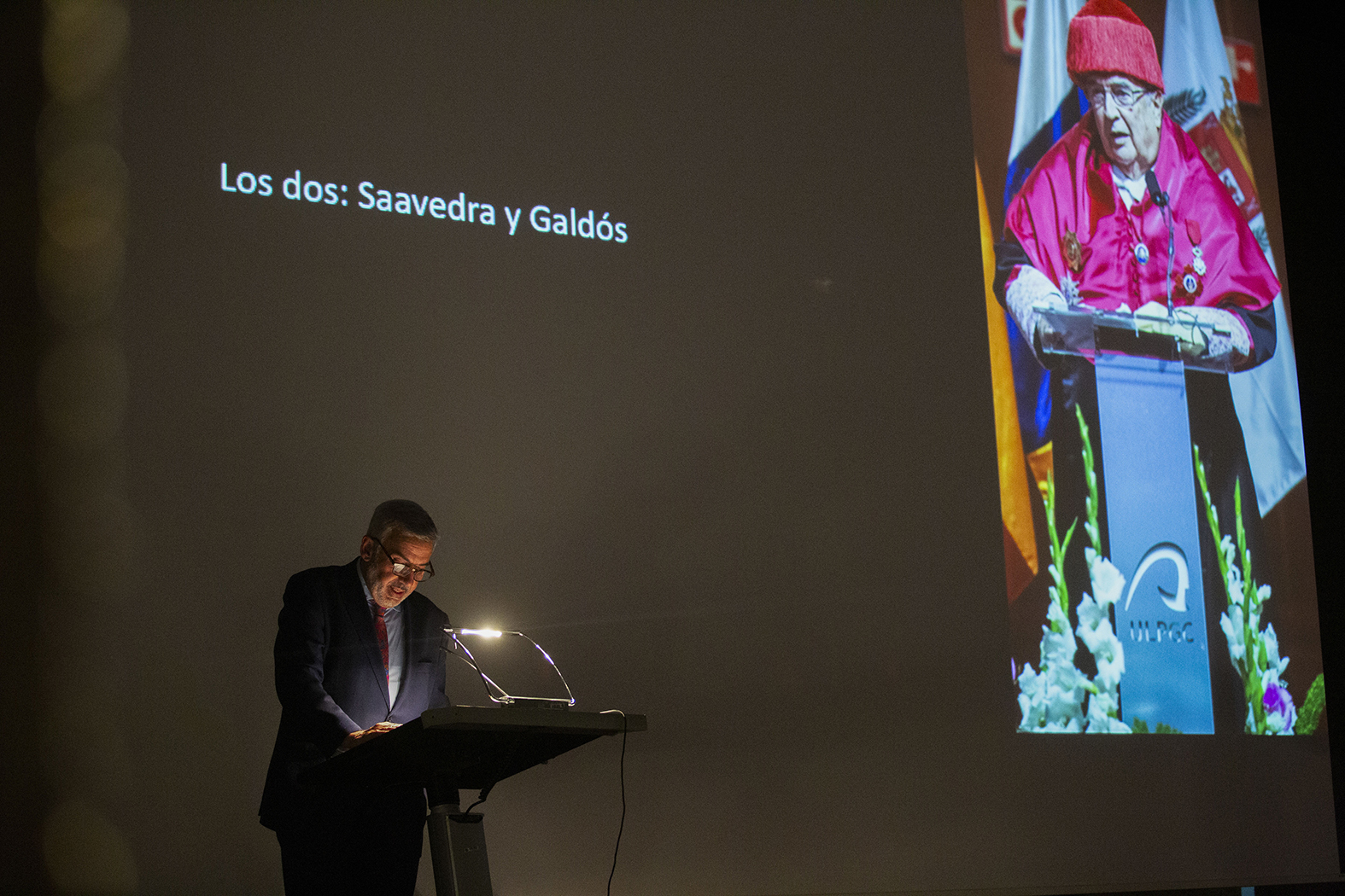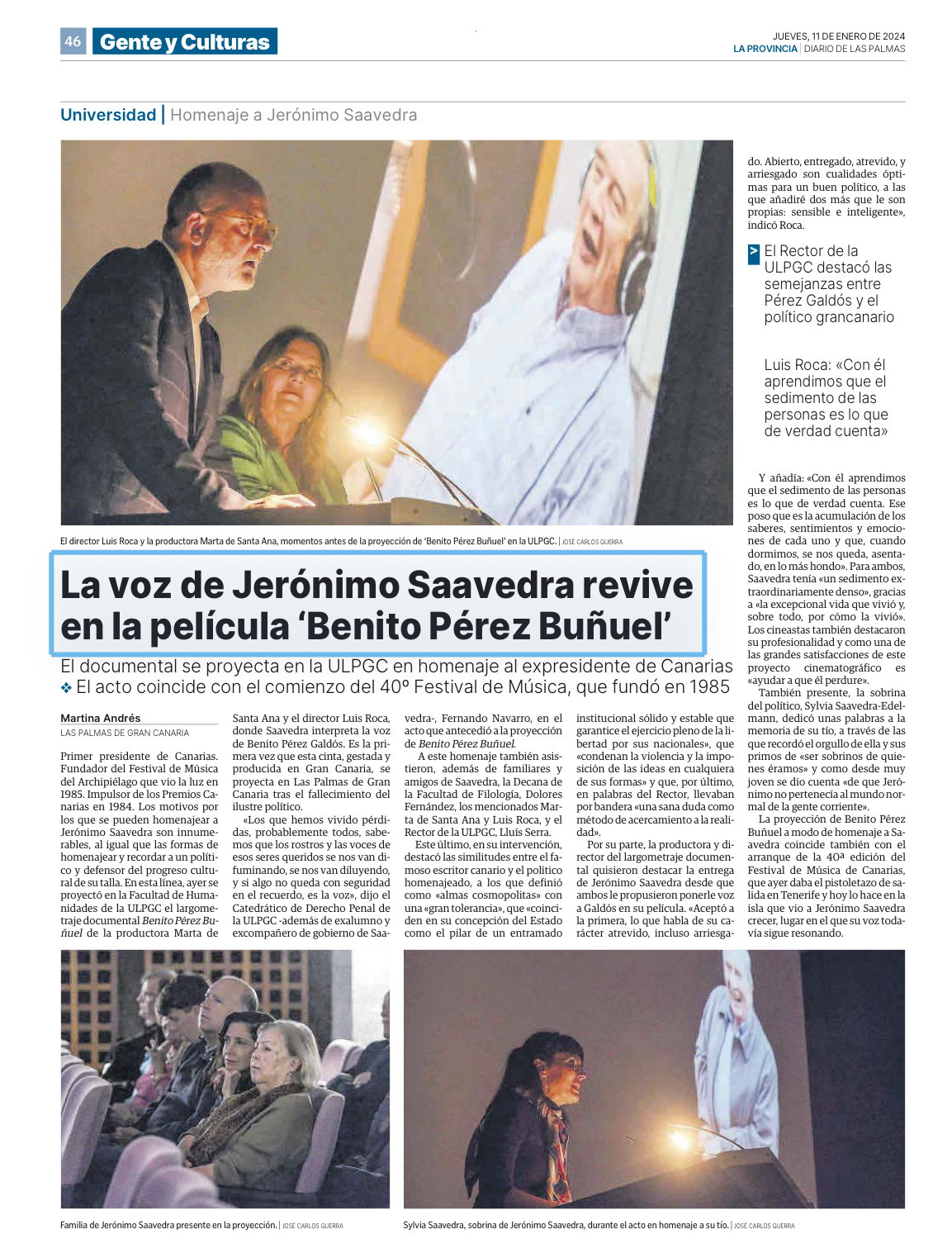 El pasado 10 de enero, el primer presidente de Canarias Jerónimo Saavedra, fallecido el 21 de noviembre de 2023, fue homenajeado, en el Salón de Actos del Edificio de Humanidades de la ULPGC, con la proyección del largometraje documental canario “Benito Perez Buñuel”, en donde Saavedra interpretó la voz de Benito Pérez Galdós.