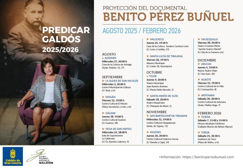 La iniciativa la organiza la Consejería de Cultura del Cabildo de Gran Canaria, con el impulso de la productora Marta de Santa Ana, y ha contado con el respaldo de todos los ayuntamientos contactados. Suma 17 municipios, a los que hay que añadir los cuatro donde “Benito Pérez Buñuel” ya se había proyectado (Las Palmas de Gran Canaria, Moya, Firgas y Santa Brígida).