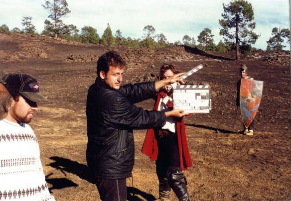 En 1996 fui script de «La isla del infierno», de Javier Fernández-Caldas, rodada entre Tenerife y Agaete durante 9 semanas y media. Está ambientaba en el siglo XV, en tiempos de la conquista de Canarias. En la imagen, se me ve con la claqueta tapando parcialmente a José Conde (Pepe Conde) a quien conocí durante ese rodaje y cuya muerte este año lamenté como tantos otros. Me alegré de que Pepe fuera recordado entre los que fallecieron en 2011 en la Gala de los 26 Premios Goya. Aquí interpretaba a un capitán algo trastornado que veía en cabalgar a lomos de avestruz una posibilidad de revolucionar los medios de locomoción.
