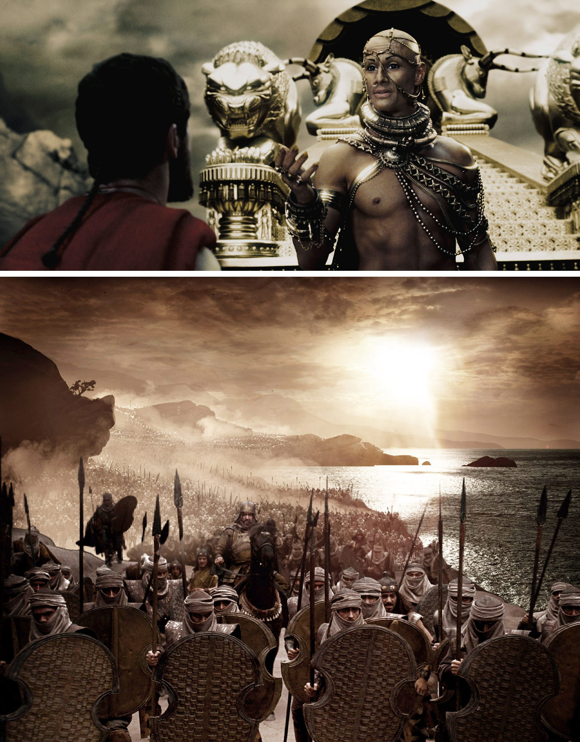 9 y 10) Los trigales dorados de «300» en un momento del filme, con la princesa Gorgo (Lena Headey); «Drag» Jerjes (Rodrigo Santoro) trata de negociar en vano con el rey Leonidas (Gerard Butler); y persas más persas a punto de empezar la lucha.