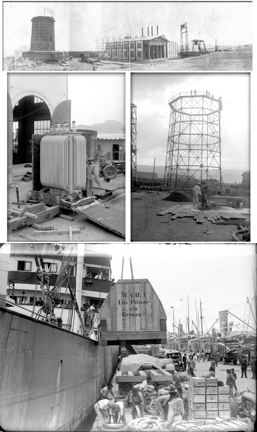 3) La fotografía superior no pertenece al conjunto ahora recuperado. La he incluído porque muestra la central en una fase muy avanzada de construcción, con el «torreón de la Cicer», torre de refrigeración de la instalación, a la izquierda de la imagen. En las dos imágenes verticales, sí pertenecientes al conjunto ahora recuperado, la de la izquierda muestra el contenido de la caja que en la foto de la esquina superior derecha del collage anterior mostraba a operarios trasportándola: se trataba un transformador para la central. La de su derecha muestra la estructura del torreón de la Cicer durante su construcción, con trabajadores en lo más alto. Debajo, trabajos de descarga en el puerto de la Luz de los materiales de la central, provenientes de la ciudad alemana de Bremen.