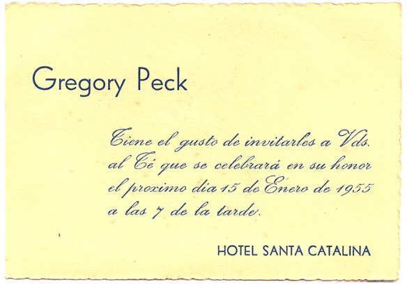 13) aportada por Teresa Lleó, invitación personal impresa a nombre de Gregory Peck para una recepción en el hotel Santa Catalina de Las Palmas de Gran Canaria; fotografía aportada por Elena Jorge Padrón, que muestra a John Huston (2i) y Gregory Peck (1d) en la recepción del cónsul británico Gerardo Miller (2d) en el hotel Santa Catalina. Con ellos, los padres de Elena Jorge (1i y 3i), propietarios del varadero donde se construyó la ballena. En el reverso la foto incluye la fecha de realización: 20 de enero de 1955;